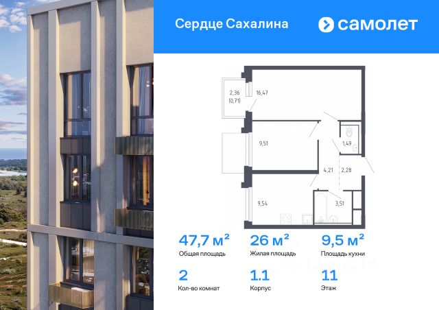 Строим кварталы для жизни с заботой о будущем. Предлагается 2-комнатная квартира комфорт-класса 47,72 кв.м в корпусе 1.1 на 11 этаже, в ЖК "Сердце Сахалина" Квартира с чистовой отделкой. Доступность дополнительных опций уточняйте у застройщика. Приобрести квартиру возможно по специальным акциям от застройщика, с текущими условиями акций можно ознакомиться в блоке "Акций". Цена динамическая и может отличаться, уточняйте актуальность у застройщика. Теперь и на острове — мы строим свой первый проект на Сахалине, в городе Корсакове. До Южно-Сахалинска — 50 минут на автомобиле, до ж/д станции Корсаков — 12 минут. Жить в "Сердце Сахалина" — значит гулять вдоль Тихого океана, пробовать устрицы на озере Буссе и кормить белок в Корсаковском парке. После работы можно зайти в магазин или пекарню у дома. Дети смогут сами ходить в школу или детский сад на территории проекта. Рядом уже есть фитнес-центры, детский сад и школы. Вертикальная игра окон, декоративные вставки и элементы — каждый корпус высотой 917 этажей особенный. Во дворе — видовой парк, горный ручей и панорамные площадки. Для детей построим игровой комплекс, для родителей — воркаут-зону, для автомобилистов — плоскостные наземные паркинги. Все входные группы — на уровне земли. Есть отдельные колясочные. Выбирайте уютную студию или просторную четырехкомнатную квартиру с гардеробной и наслаждайтесь видами с панорамного балкона.