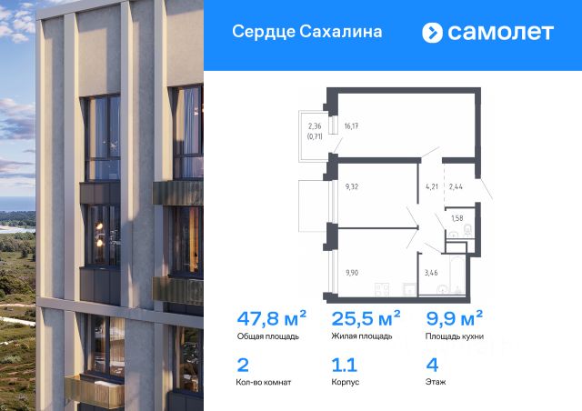 Предлагается 1-комнатная квартира комфорт-класса 45,6 кв.м в корпусе 1.1 на 4 этаже, в ЖК "Сердце Сахалина" Квартира без отделки. Доступность опции "отделка" и возможность комплектации мебелью и декором уточняйте у застройщика. Приобрести квартиру возможно по специальным акциям от застройщика, с текущими условиями акций можно ознакомиться в блоке "Акций". Цена динамическая и может отличаться, уточняйте актуальность у застройщика. Теперь и на острове — мы строим свой первый проект на Сахалине, в городе Корсакове. До Южно-Сахалинска — 50 минут на автомобиле, до ж/д станции Корсаков — 12 минут. Жить в "Сердце Сахалина" — значит гулять вдоль Тихого океана, пробовать устрицы на озере Буссе и кормить белок в Корсаковском парке. После работы можно зайти в магазин или пекарню у дома. Дети смогут сами ходить в школу или детский сад на территории проекта. Рядом уже есть фитнес-центры, детский сад и школы. Вертикальная игра окон, декоративные вставки и элементы — каждый корпус высотой 917 этажей особенный. Во дворе — видовой парк, горный ручей и панорамные площадки. Для детей построим игровой комплекс, для родителей — воркаут-зону, для автомобилистов — плоскостные наземные паркинги. Все входные группы — на уровне земли. Есть отдельные колясочные. Выбирайте уютную студию или просторную четырехкомнатную квартиру с гардеробной и наслаждайтесь видами с панорамного балкона.