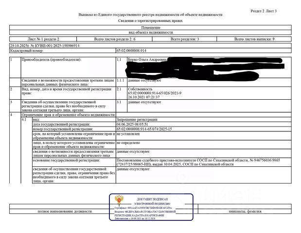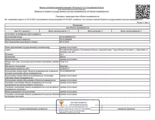 Данные получены с сайта ГИС Торги. Квартира, площадью 34,1 кв.м., к/н 65:02:0000008:914, расположенная по адресу: Сахалинская область, с. Березняки, ул. Зеленая, д. 22, кв. 5. Организатор торгов сведениями о зарегистрированных в жилом помещении лицах не располагает (судебным приставом-исполнителем не предоставлены). По состоянию на 04.08.2025 задолженность по капитальному ремонту отсутствует. Должник: Борко О.А. Обременение: арест, залог.