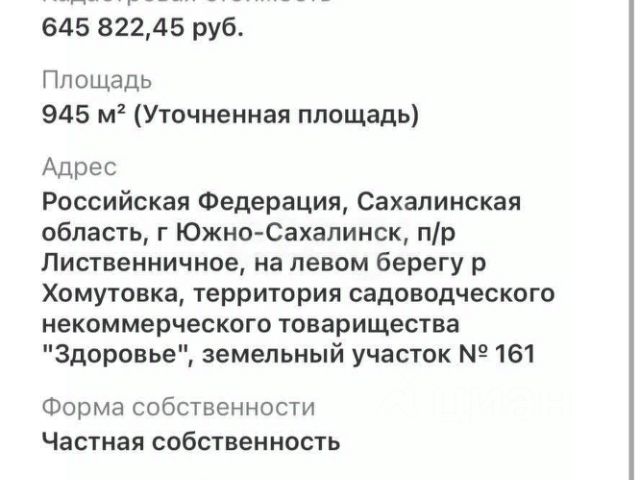 Продам отличный земельный участок первая линия 9 соток, собственностью. Район Хомутово г. Южно-Сахалинск п/р Лиственничное ул 2-я Центральная, левый берег реки Хомутовка СНТ"Здоровье". Перспективное место для строительства частного дома. Район газифицирован. Подведено электричество, установлен прибор эл. Учёта, участок отсыпан, сделан заезд. До товарищества построена капитальная асфальтированная дорога, чиститься круглый год. Первая линия. Участок отсыпан,границы вынесены. Зона С3 позволяет построить капитальный дом и прописаться в нём. Кадастровый номер 65:01:1101002 :85