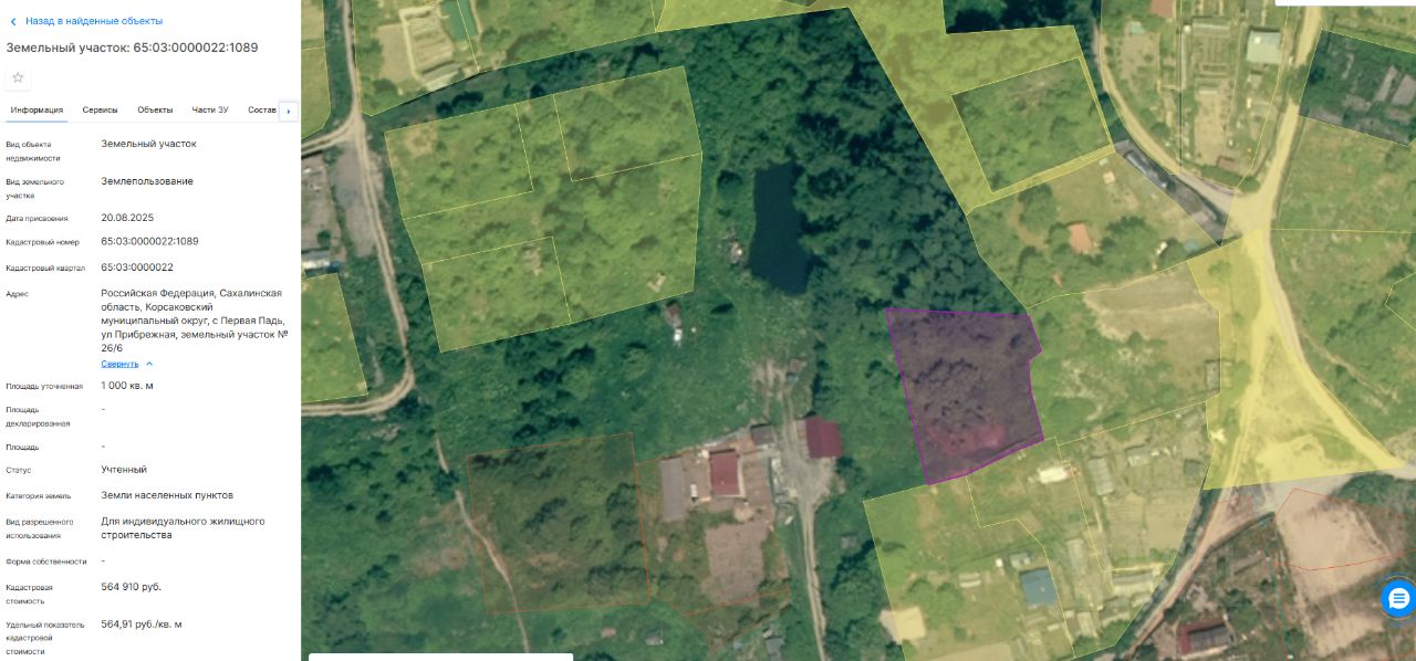Земельный участок с кадастровым номером: 65:03:0000022:1089, расположенный по адресу: Российская Федерация, Сахалинская область, Корсаковский муниципальный округ, с. Первая Падь, ул. Прибрежная, земельный участок 26/6, площадью 1000 кв. метров, с видом разрешенного использования: "Для индивидуального жилищного строительства", ( в соответствии с пунктом 1 статьи 39.18 Земельного кодекса Российской Федерации, было размещено извещение на официальном сайте https://torgi.gov.ru/new/public от 09.04.2025 22000018960000000197 лот 1)