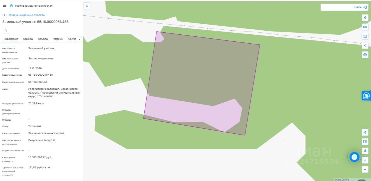 Земельный участок с кадастровым номером 65:16:0000051:488, расположенный: Сахалинская область, р-н Поронайский, с. Тихменево, площадью 73 299 кв.м., разрешенное использование - энергетика (код 6.7), сроком на 5 лет. Транспортная доступность: подъездные пути отсутствуют.