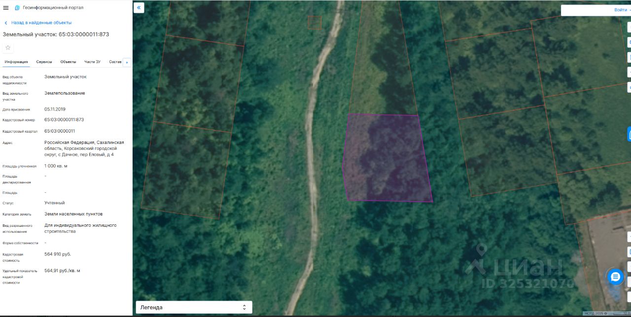 Земельный участок (кадастровый номер 65:03:0000011:873), расположенный по адресу: Российская Федерация, Сахалинская область, Корсаковский городской округ, с. Дачное, пер. Еловый, д. 4, площадью 1000 кв. метров, с видом разрешенного использования: "Для индивидуального жилищного строительства" ( в соответствии с пунктом 1 статьи 39.18 Земельного кодекса Российской Федерации было размещено извещение на официальном сайте https://torgi.gov.ru/new/public от 20.08.2025 22000018960000000328 лот 1)