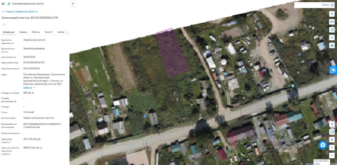 Земельный участок с кадастровым номером: 65:03:0000002:374, расположенный по адресу: Российская Федерация, Сахалинская область, Корсаковский муниципальный округ, с. Лесное, ул. Морская, земельный участок 26/2, площадью 606 кв. метров, с видом разрешенного использования: "Для индивидуального жилищного строительства", соответствии с пунктом 1 статьи 39.18 Земельного кодекса Российской Федерации размещено извещение на официальном сайте https://torgi.gov.ru/new/public от 13.08.2025 22000018960000000320 лот 1).