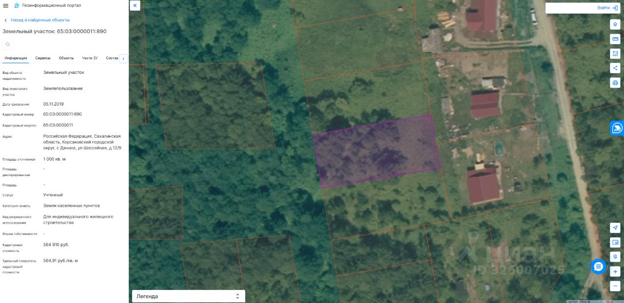 Земельный участок (кадастровый номер 65:03:0000011:890), расположенный по адресу: Российская Федерация, Сахалинская область, Корсаковский городской округ, с. Дачное, ул. Шоссейная, д. 12/9, площадью 1000 кв. метров, с видом разрешенного использования: "Для индивидуального жилищного строительства", в соответствии с пунктом 1 статьи 39.18 Земельного кодекса Российской Федерации размещено извещение на официальном сайте https://torgi.gov.ru/new/public от 03.09.2025 22000018960000000333 лот 1).