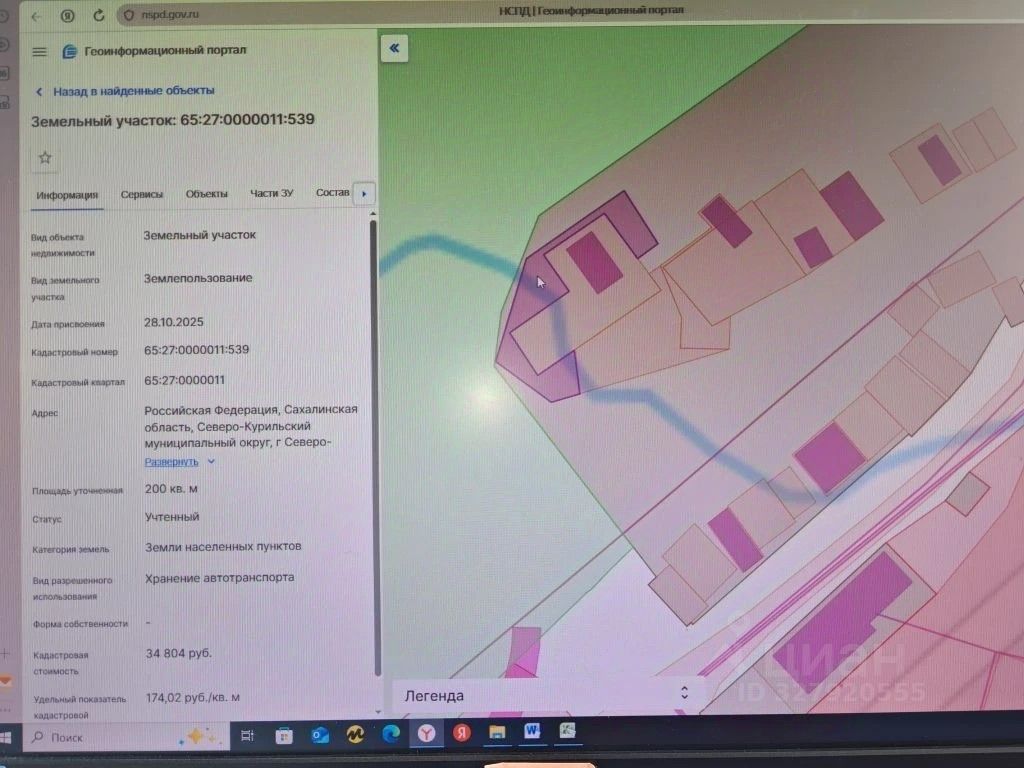 Земельный участок с кадастровым номером 65:27:0000011:539, площадь 200 кв.м., местоположение: Российская Федерация, Сахалинская область, Северо-Курильский муниципальный округ, г. Северо-Курильск, ул. 60 лет Октября, категория земель: земли населенных пунктов, вид разрешенного использования: хранение автотранспорта, цель использования земельного участка: строительство гаража