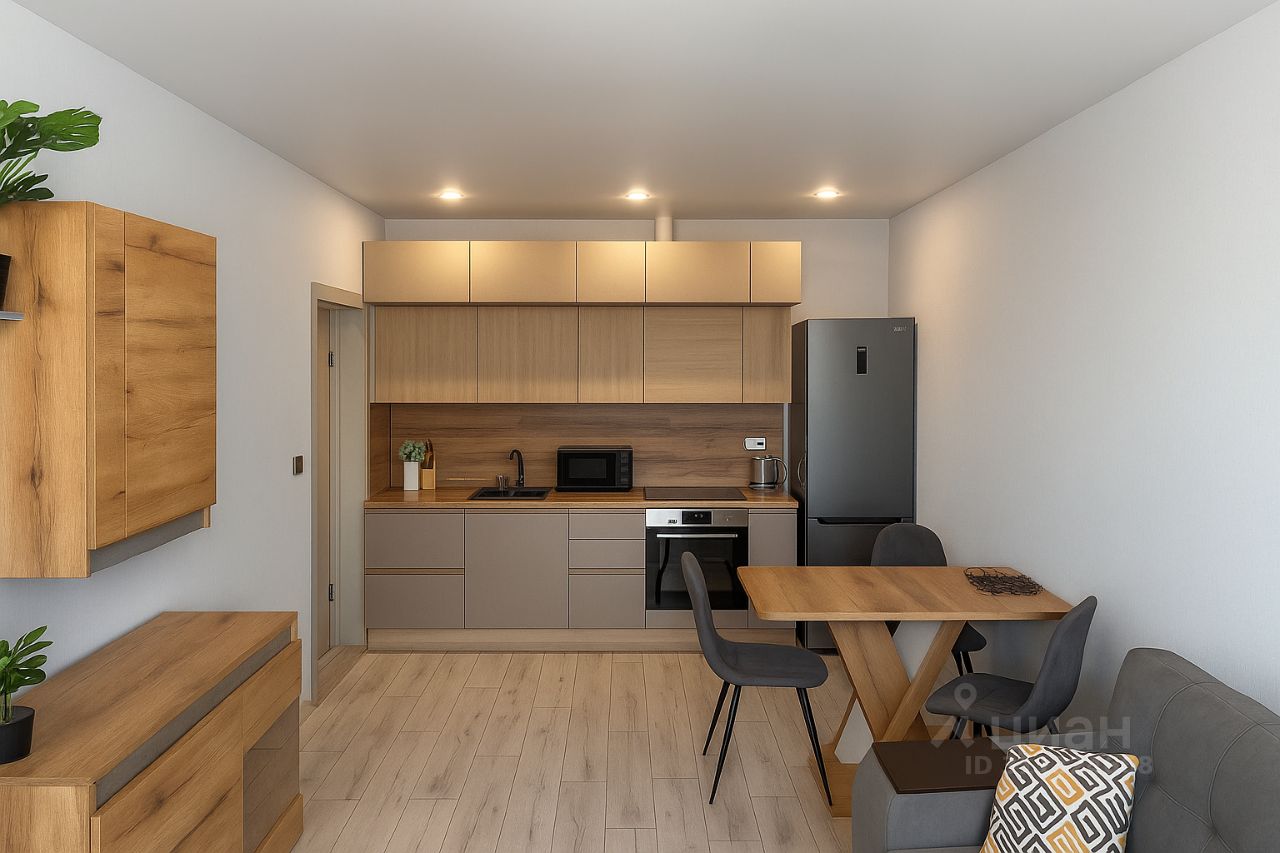 Кухня оборудована: Холодильником, Варочной панелью, Микроволновой печью, Чайником, а также посудой и столовыми приборами.