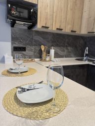 В апартаментах возможно размещение 3 человек. Спальные места: двуспальная кровать, раскладной диван. Кухня оборудована необходимой посудой и техникой: электрическая плита, холодильник, чайник, микроволновка. К услугам гостей также Wi-F, телевизор, стиральная машина, постельное белье, полотенца, фен, утюг с гладильной доской, сушилка для одежды, гигиенические принадлежности.