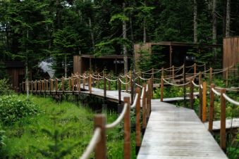 У нас вы можете разместиться в уютных домах из натуральных материалов с собственными террасами и панорамными окнами, из которых виден заповедный лес.