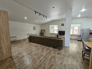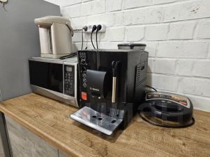 Кухня оснащена электрической плитой, духовым шкафом, посудомоечной машиной. Для кофеманов есть кофемашина. Чистейшая вода в доме из артезианской скважины, благодаря системе установленных фильтров, пригодна для питья из-под крана. В гостиной огромный раздвижной диван ожидает большую компанию (он же - очень просторное спальное место для двоих).