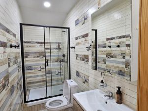 Ванная комната с душевой кабиной, полотенцами и феном.