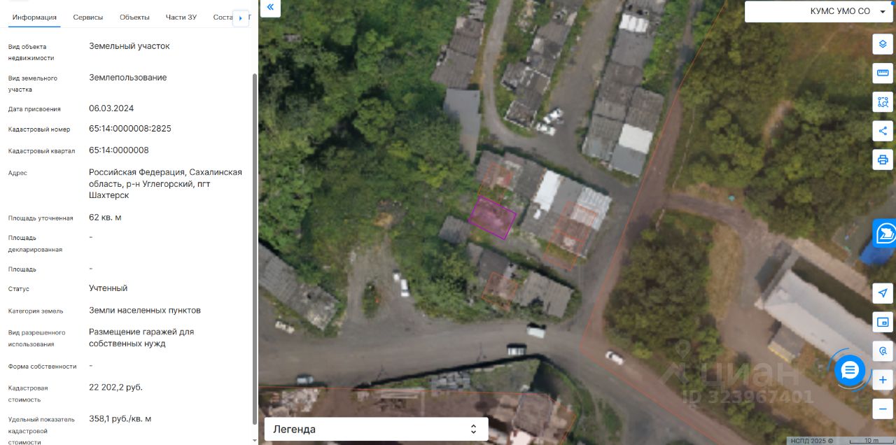 Государственная собственность на земельный участок не разграничена. Местоположение: Российская Федерация, Сахалинская область, р-н Углегорский, пгт. Шахтерск. Площадь 62 кв.м. Вид использования: Размещение гаражей для собственных нужд. Кадастровый номер - 65:14:0000008:2825. Категория земель - земли населенных пунктов. Обременение правами других лиц: нет.