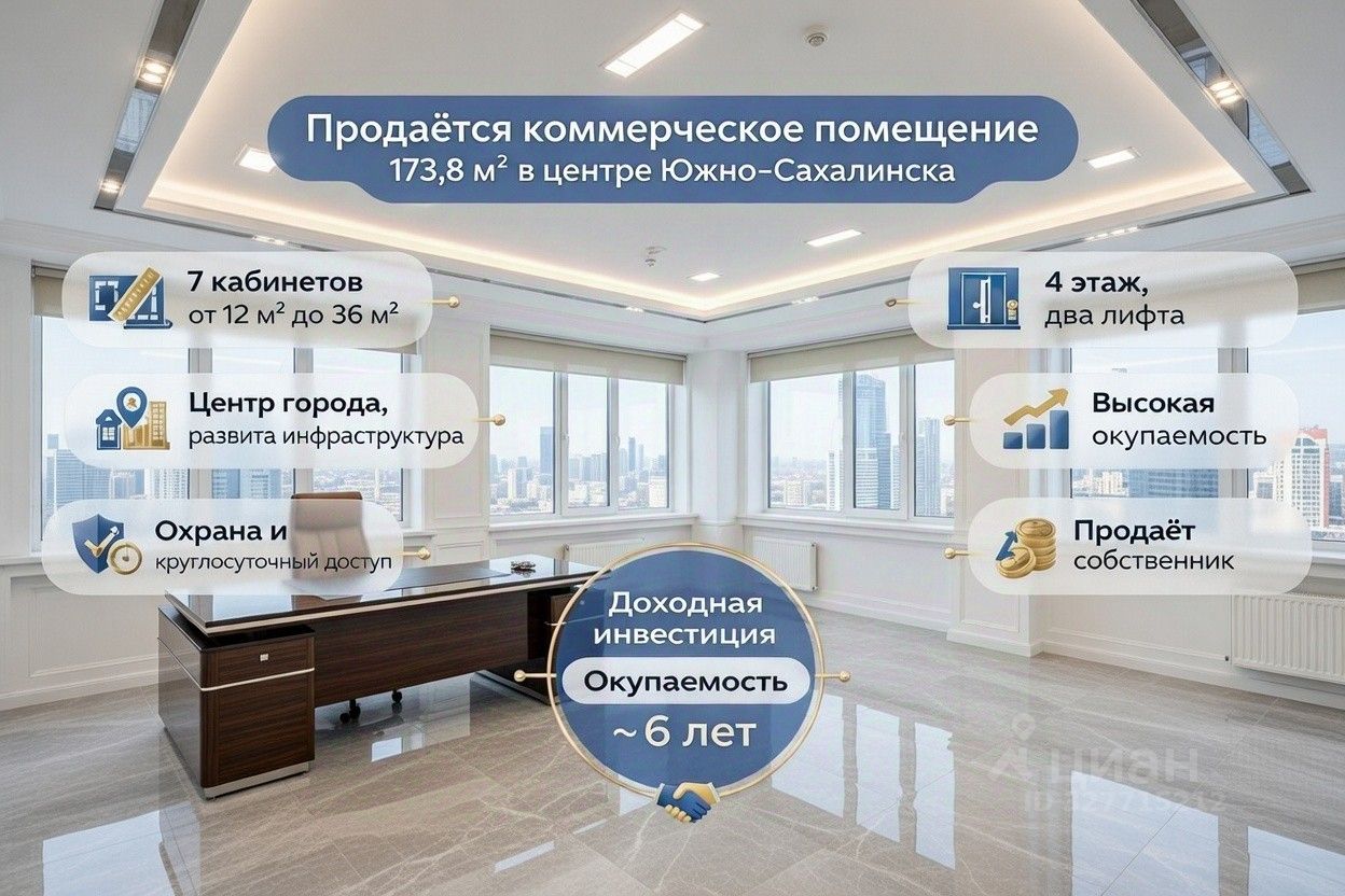 Общая площадь 173,8 м² из 7 кабинетов от 12м² до 36м², 4 этаж 7 этажного бизнес центра, в самом центре Южно-Сахалинска, напротив строится ЖК "ЛЕГЕНДА".