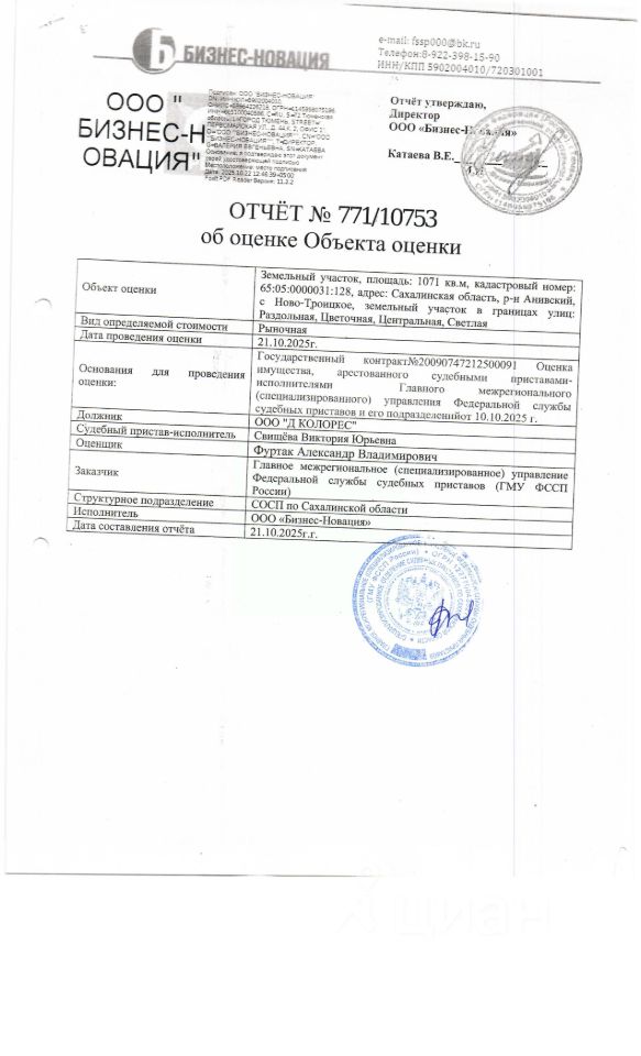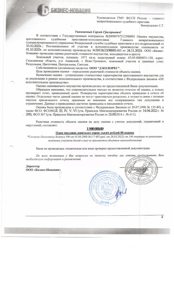 Земельный участок, площадью 1071, к/н 65:05:0000031:128, расположенный: Сахалинская область, с. Ново-Троицкое, в границах улиц Раздольная, Цветочная. Должник: ООО "Д Колоресс". Обременение: арест.