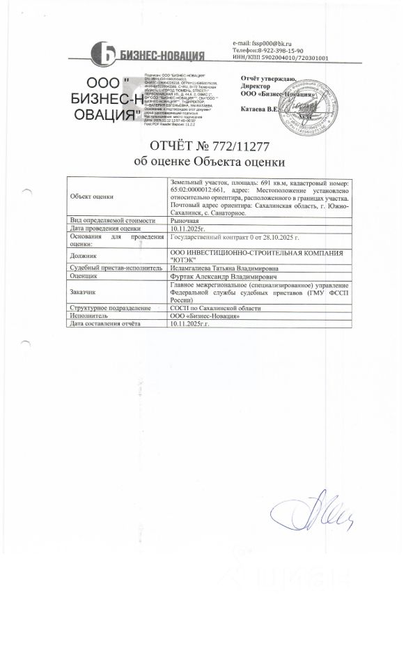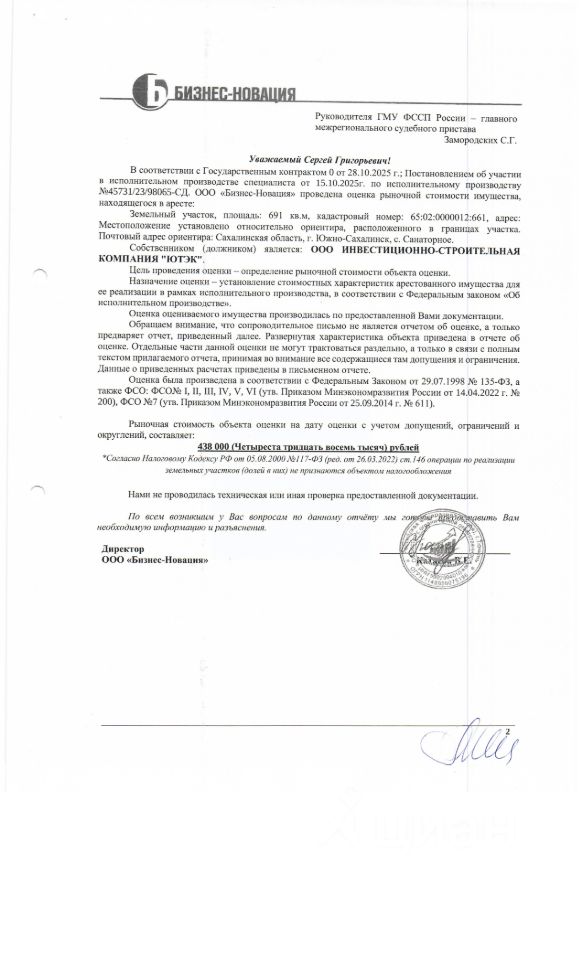 Земельный участок, площадью 691 кв.м., расположен относительно ориентира, по адресу: Сахалинская область, г. Южно-Сахалинск, с. Санаторное, к/н 65:02:0000012:661. Должник: ООО "Ютек". Обременение: арест.