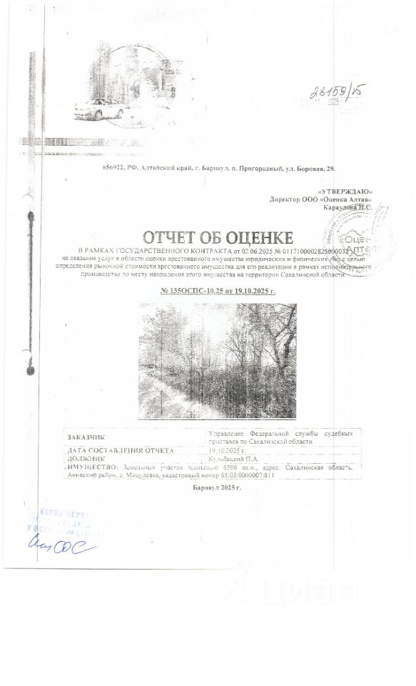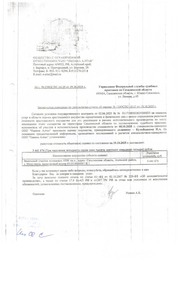 Земельный участок, площадью 6506 кв.м., к/н 65:05:0000007:811 Расположенный по адресу: Сахалинская область, Анивский район, с. Мицулевка. Должник: Кульбацкий П.А. Обременение: арест.