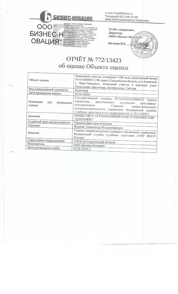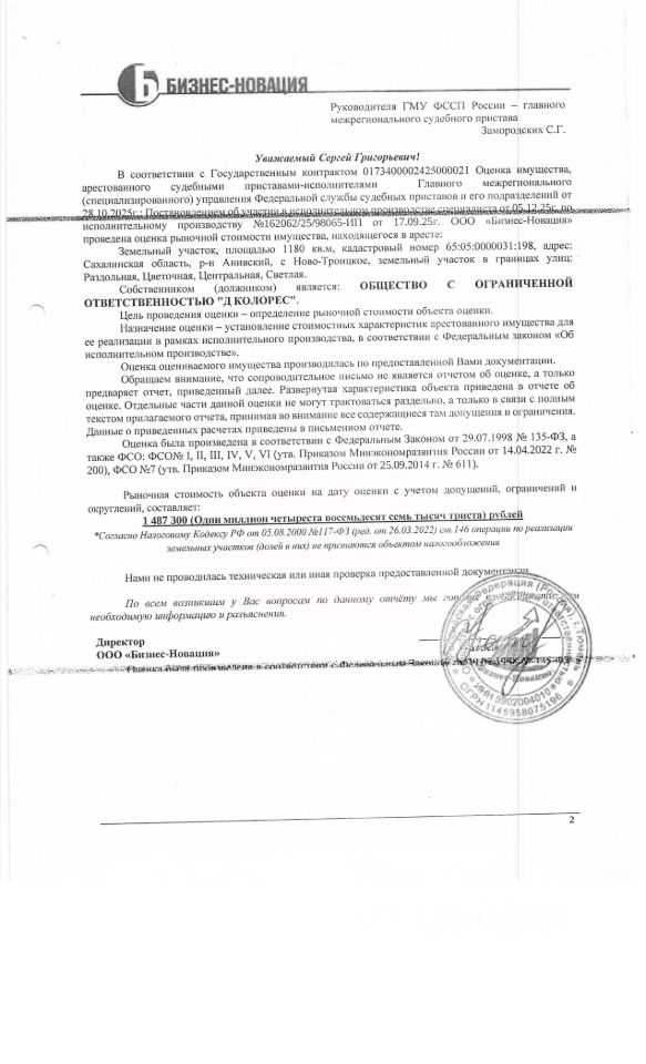 земельный участок, площадью 1180 кв.м., к/н 65:05:0000031:198, расположенный по адресу: Сахалинская область, с. Ново-Троицкое, в границах улиц Раздольная, Цветочная. Должник: ООО "Д-Колорес". Обременение: арест.