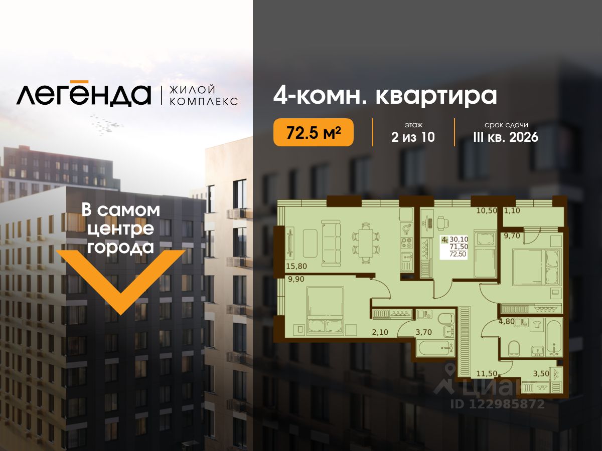 Продаётся 4-комнатная квартира 72.50 кв. м. в новом жилом комплексе "Легенда", расположенном в самом центре города - в границах улицы им. Ф. Э. Дзержинского, просп. Мира и улицы им. Космонавта Поповича.