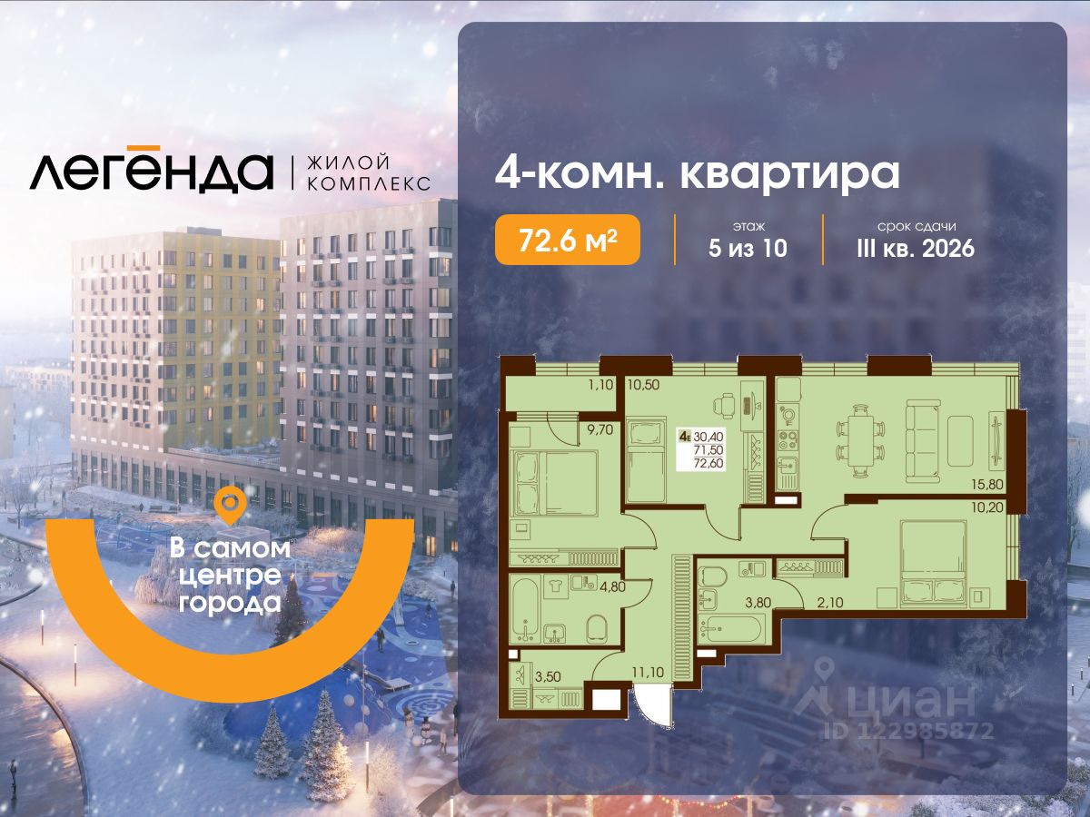 Продаётся 4-комнатная квартира 72.60 кв. м. в новом жилом комплексе "Легенда", расположенном в самом центре города - в границах улицы им. Ф. Э. Дзержинского, просп. Мира и улицы им. Космонавта Поповича.