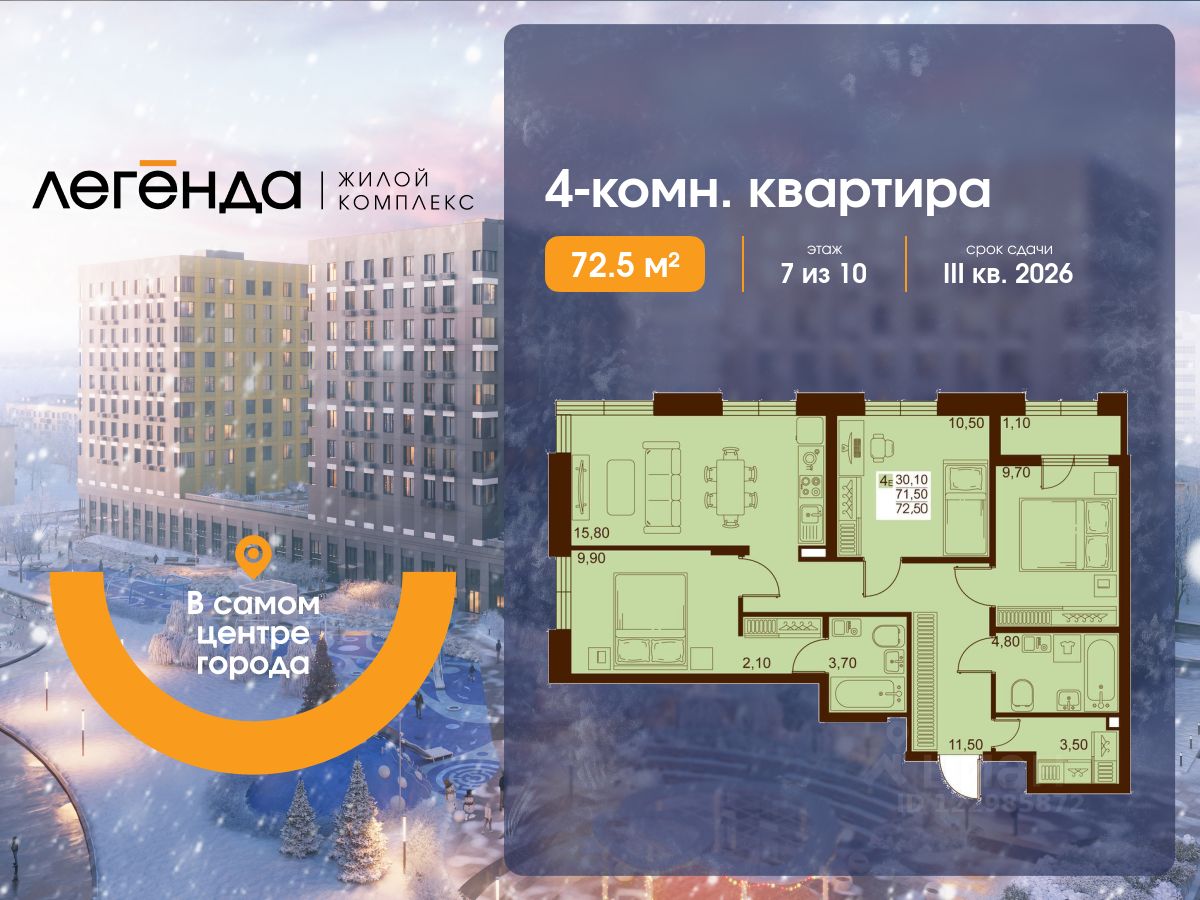 Продаётся 4-комнатная квартира 72.50 кв. м. в новом жилом комплексе "Легенда", расположенном в самом центре города - в границах улицы им. Ф. Э. Дзержинского, просп. Мира и улицы им. Космонавта Поповича.