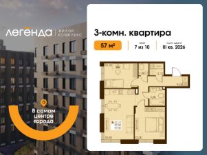 Продаётся 3-комнатная квартира 57.00 кв. м. в новом жилом комплексе "Легенда", расположенном в самом центре города - в границах улицы им. Ф. Э. Дзержинского, просп. Мира и улицы им. Космонавта Поповича.
