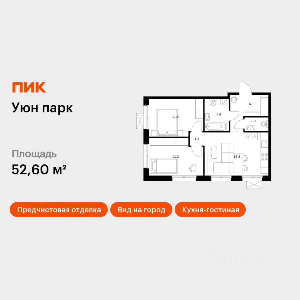 Продаётся 2-комн. квартира площадью 52,6 кв.м на 17 этаже 17 этажного дома (Корпус 12, Секция 1) проекта ПИК Уюн парк. Светлый просторный подъезд на уровне земли, функциональная планировка, большие окна, .