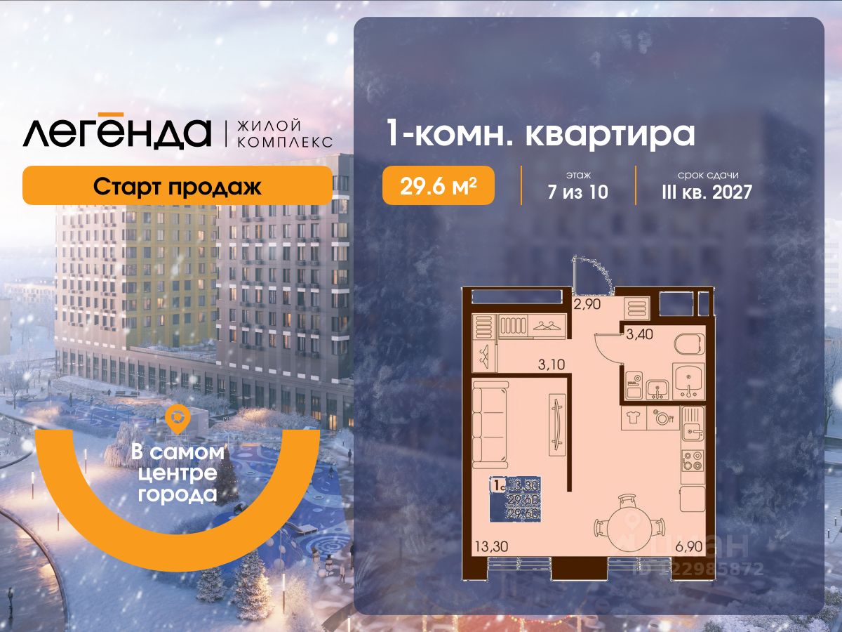 Продаётся 1-комнатная квартира 29.60 кв. м. в новом жилом комплексе "Легенда", расположенном в самом центре города - в границах улицы им. Ф. Э. Дзержинского, просп. Мира и улицы им. Космонавта Поповича.