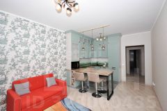 В отделке использованы современные материалы, а в зоне кухни, прихожей и на балконе уложена система теплого пола, создающая особый уют в холодный период. Квартира полностью укомплектована всей необходимой мебелью и встроенной бытовой техникой премиум-класса, включая посудомоечную машину, духовой шкаф, варочную панель, холодильник и стиральную машину, что позволяет заселиться сразу после приобретения.
