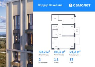 Строим кварталы для жизни с заботой о будущем. Предлагается 2-комнатная квартира комфорт-класса 59,23 кв.м в корпусе 1.1 на 13 этаже, в ЖК "Сердце Сахалина"