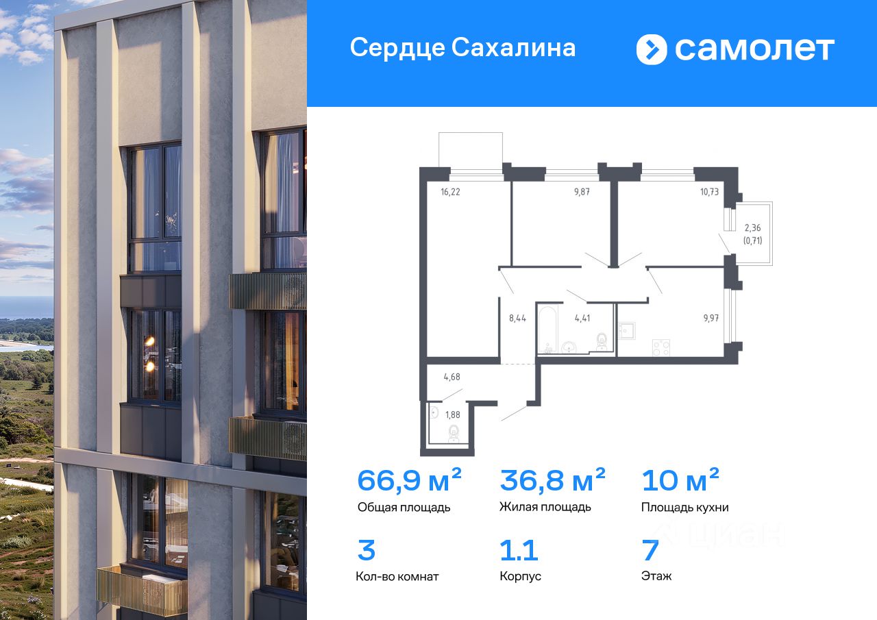 Строим кварталы для жизни с заботой о будущем. Предлагается 3-комнатная квартира комфорт-класса 66,91 кв.м в корпусе 1.1 на 7 этаже, в ЖК "Сердце Сахалина"