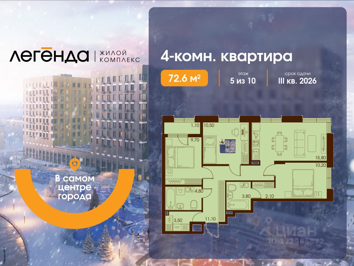 Продаётся 4-комнатная квартира 72.60 кв. м. в новом жилом комплексе "Легенда", расположенном в самом центре города - в границах улицы им. Ф. Э. Дзержинского, просп. Мира и улицы им. Космонавта Поповича.