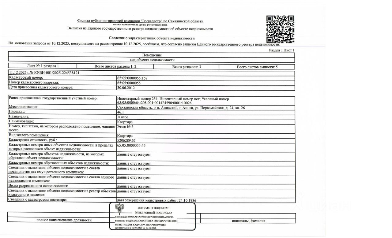 Квартира, площадью 46,1 кв.м., к/н 65:05:0000055:157, этаж 3. Расположенная по адресу: сахалинская область, г. Анива, ул. Первомайская д. 24, кв. 26. Согласно справке о прописанных лицах в квартире зарегистрирован 1 чел. По состоянию на 15.09.2025 задолженность по капитальному ремонту составляет 4301,50 руб, пени 44,57 руб. Должник: Ударцева Я.С. Обременение: арест, залог.