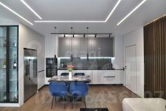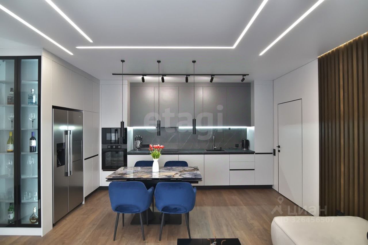 Кухня полностью укомплектована встроенной техникой: посудомоечной машиной, микроволновой печью, духовым шкафом, вытяжкой, варочной индукционной панелью, большим