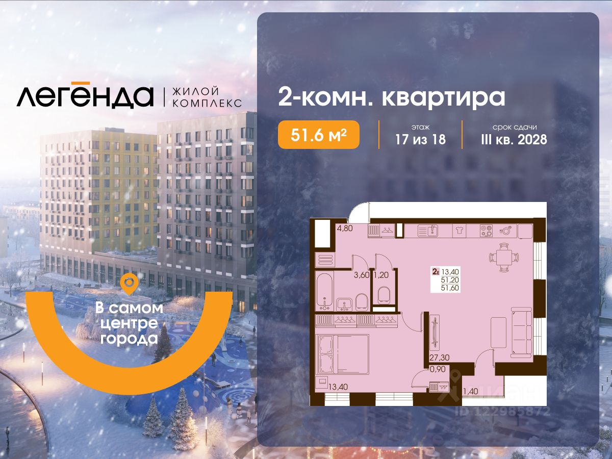 Продаётся 2-комнатная квартира 51.60 кв. м. в новом жилом комплексе "Легенда", расположенном в самом центре города - в границах улицы им. Ф. Э. Дзержинского, просп. Мира и улицы им. Космонавта Поповича.