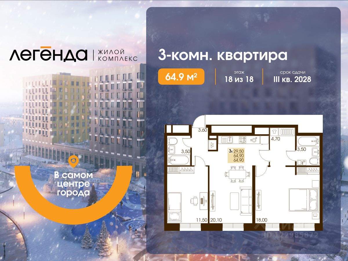 Продаётся 3-комнатная квартира 64.90 кв. м. в новом жилом комплексе "Легенда", расположенном в самом центре города - в границах улицы им. Ф. Э. Дзержинского, просп. Мира и улицы им. Космонавта Поповича.