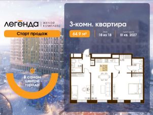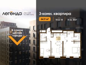 Продаётся 3-комнатная квартира 64.90 кв. м. в новом жилом комплексе "Легенда", расположенном в самом центре города - в границах улицы им. Ф. Э. Дзержинского, просп. Мира и улицы им. Космонавта Поповича.