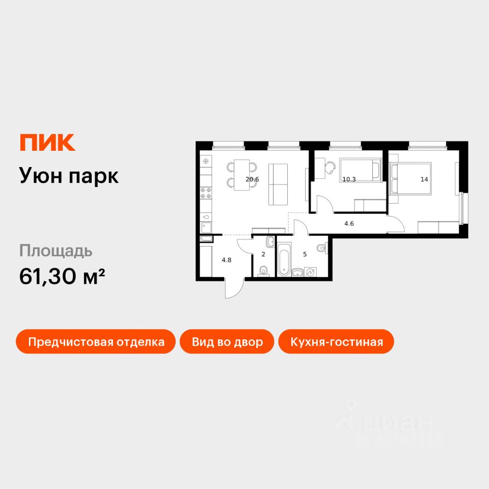 Продаётся 2-комн. квартира площадью 61,3 кв.м на 1 этаже 17 этажного дома (Корпус 12, Секция 1) проекта ПИК Уюн парк. Светлый просторный подъезд на уровне земли, функциональная планировка, большие окна, .