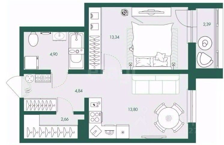 Квартира функциональна: площадь рационально распределена между жилыми зонами и кухней, что создает основу для комфортного проживания.