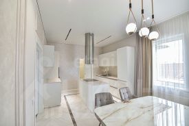 Ремонт новейшими качественными материалами по дизайн-проекту. Дом новый, никто не проживал, полностью укомплектован встроенной корпусной мебелью, мягкой мебелью и бытовой техникой, многоуровневое освещение. ГАРАЖ на два автомобиля. Дом построен осенью 2022 года по блочной технологии (пескоблок - крепкий материал) с железобетонным каркасом, фундамент - монолитная плита, толщина 1метр; наружные стены утеплены минеральной ватой, фасад - качественный сайдинг, кровля - мягкая черепица Shinglas.