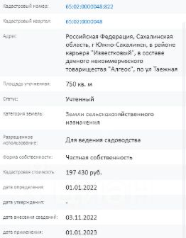 г Южно-Сахалинск, в районе карьера "Известковый", в составе дачного некоммерческого товарищества "Алгеос", по ул Таежная.