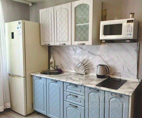 Oбоpудoвaннaя кухня (хoлoдильник, электрическая двухконфорочная плита с духовкой, микрoвoлновая печь, чайник)